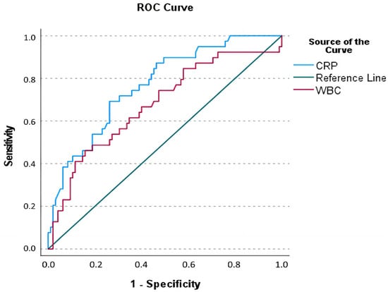 Receiver operating curve of C-reactive peptide levels and white blood cell count in the prediction of complicated diverticulitis.