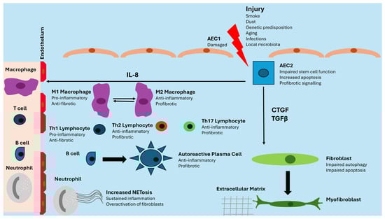 AEC2 cells are pressed into service to renew injured AEC1 cells, but the genetic and epigenetic alterations previously described lead to impaired stem cell function, apoptosis, and pro-fibrotic signaling mediated by Transforming Growth Factor β (TGFβ), Connective Tissue Growth Factor (CTGF), and IL8. TGFβ and CTGF favor the transition of fibrocytes and fibroblasts into myofibroblasts, while IL8 has a chemoattractant action on innate immunity cells. Lung fibroblasts show impaired autophagy and apoptosis, two mechanisms involved in the control of damaged and senescent cells. Under continuous profibrotic signals, they expand prolifically and differentiate into myofibroblasts, with an increased capacity for producing extracellular matrix [15,16]. The immune system plays a controversial role. During the first stages, M1-polarized macrophages show anti-fibrotic properties, but in the second phase, M2-polarized macrophages display fibrotic activity. Neutrophils are recruited in the damaged lung and favor fibrosis through NETosis, whereas adaptive immunity is characterized by the production of pro-inflammatory and anti-fibrotic cytokines by Th1 lymphocytes in the first stages and by the secretion of anti-inflammatory and pro-fibrotic mediators by Th2 and Th17 lymphocytes in the established disease. Active B lymphocytes also produce autoantibodies against lung self-antigens [17]. The immune system may play different roles in lung fibrosis when it is associated with idiopathic or secondary forms [11]. Figure 1 summarizes these processes schematically.