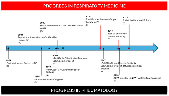 Polymyalgia Rheumatica is characterized by severe morning stiffness of the shoulder and hip girdles which is associated with severe inflammation without peripheral joint swelling. In seronegative patients presenting with PMR, the misclassification of RA-ILD as IPF is understandable, given their similar risk factors, radiological pattern, and even progression of lung damage [28]. The identification of ACPA is crucial for RA diagnosis: the progressive spread of ACPA testing in routine clinical practice since the inclusion of ACPA in the 2010 classification criteria for RA has greatly increased sensitivity in RA diagnoses in different settings [29,30,31,32,33,34]. The improved recognition of RA features in respiratory settings may have influenced the enrollment of patients in the PANTHER study, leading to a more homogeneous cohort of IPF patients and a more reliable result (Figure 2). Conversely, the small proportion of UIP patients with an increased survival rate reported in previous studies [18,19] could be accounted for by an underlying autoimmune origin.