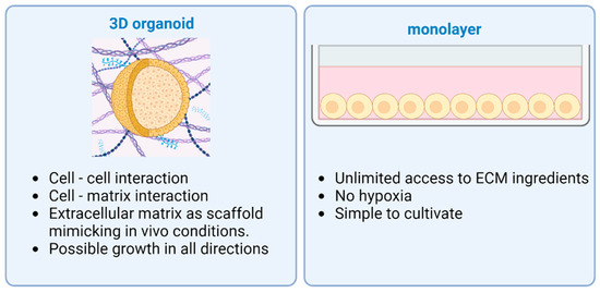 Advantages of different cell culturing methods: 3D organoid vs. 2D monolayer. Two-dimensional monolayers of cells have unlimited access to ECM ingredients, suffer less from hypoxia, and are simple to cultivate. Three-dimensional organoids are more complex structures with cell–cell and cell–matrix interaction, as well as possible growth in every direction. Created with BioRender.com.
