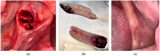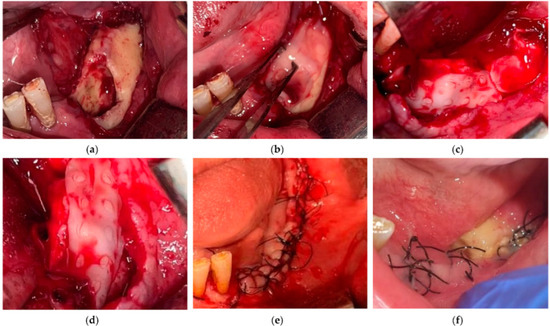 For patients confirmed with MRONJ, debridement of granulation tissue and necrotic bone was performed. Bone sequestra were completely removed until healthy bone tissue was reached using elevators or bone forceps, without using bone drills or other rotary instruments to minimize the risk of bone necrosis. Local rinses were performed with antiseptic solutions containing 0.2% chlorhexidine and 0.9% sodium chloride. In the resulting bone defect, PRF membranes were applied for patients in G1, while hemostatic materials were applied for patients in G2. A mucoperiosteal flap was created, relaxed, and freely tensioned over the defect. The flap was tightly sutured with non-absorbable 4-0 polyamide thread.