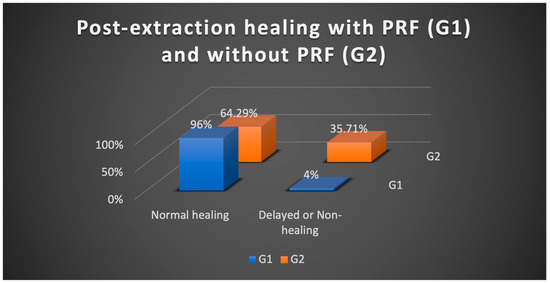 A comparison between the two groups reveals a statistically significant association between the healing rate and the application of PRF in post-extraction sockets (Chi-squared test,