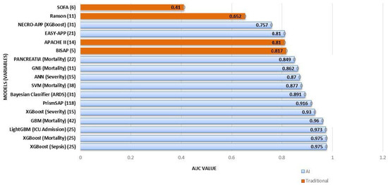 Comparison of traditional models vs. AI-based models for predicting pancreatitis severity and complications. Models with the higher AUCs.