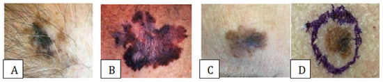 Visible characteristics for melanoma identification [14]. (A)—Asymmetry: If a line is drawn through the middle of the lesion and the two sides are not identical (asymmetrical), this could be a warning sign for melanoma [14]. (B)—Border: The edges of melanoma tend to be uneven. Irregular, unclear, or notched edges are suspected of melanoma [14]. (C)—Color: A benign mole is a single color. Multiple colors in a skin lesion may indicate melanoma [14]. (D)—Diameter: Moles larger than 6 mm in diameter may suggest melanoma [14].