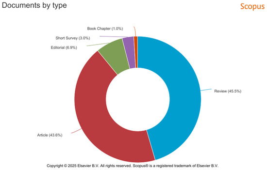 The graph in Figure 2 shows the distribution of document types related to quercetin and melanoma in the Scopus database. The most frequent publication types are reviews, representing 45.5% of the total, followed by articles, with 43.6%. This distribution suggests that the field benefits from extensive critical analysis, with many review articles evaluating the existing literature. The high proportion of reviews indicates increasing interest in consolidating and interpreting the data on the effects of quercetin in treating melanoma.