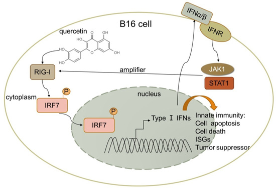The table above (Table 2) shows the multiple mechanisms of action for quercetin depending on the type of cancer. For example, by testing the effects of quercetin on two malignant melanoma cells, B16 and A375, one study proved that quercetin upregulated IFN-α and IFN-β expression by activating RIG-I promoter in B16 cells. RIG-I likely amplifies antitumor effects by activating signal transduction and activator of transcription 1 (STAT1) in the IFN-JAK-STAT pathway in an autocrine and paracrine manner (Figure 3). This results in quercetin-induced cell apoptosis and tumor suppression [16].