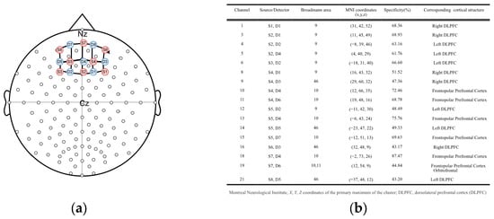fNIRS optode placement and areas of interest: (a) fNIRS configuration covering the prefrontal cortex (red circles are source channels, blue circles are detector channels, and their interconnections are shown); (b) channels represented by the channel/detector pairs used, their corresponding Brodmann regions, the MNI coordinates, the specificity percentages, and the corresponding cortical structures.