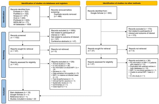 Kuraeiad, S.; Kotepui, K.U.; Mahittikorn, A.; Anabire, N.G.; Masangkay, F.R.; Wilairatana, P.; Wangdi, K.; Kotepui, M. A Systematic Review and Meta-Analysis of MIP-1α and MIP-1β Chemokines in Malaria in Relation to Disease Severity. Medicina 2025, 61, 676. https://doi.org/10.3390/medicina61040676