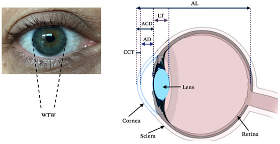 Optical biometry parameters. AL: axial length, CCT: central corneal thickness, AD: humor aqueous depth (between the corneal endothelium and anterior crystalline lens surface), WTW: white-to-white (horizontal corneal diameter), ACD: anterior camera depth (between the corneal epithelium and anterior crystalline lens surface), LT: lens thickness.