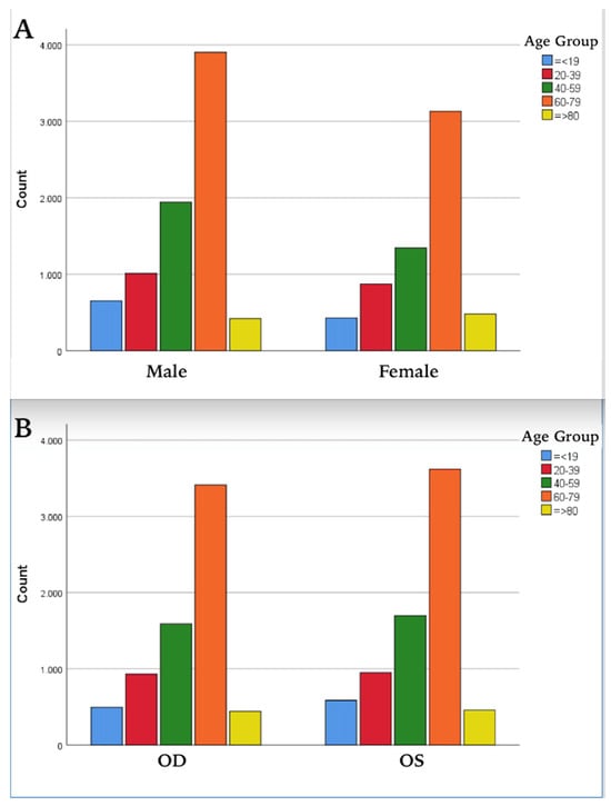 Distribution of subjects by age group, (A) gender (p = 0.001), and (B) right–left eye (p = 0.362). OD: right eye; OS: left eye.