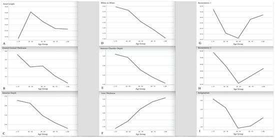 Optical biometric measurements by age group ((A–I), p = 0.001).