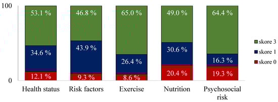 The total score of the patients was 61.05 out of a possible 93 points, where 13.55 out of a possible 21 points were scored in the domain of health status, 9.19 out of 15 points in risk factors, 15.46 out of 21 points in exercise, 12.39 out of 21 points in nutrition and 10.46 out of 15 points in psychosocial risk.