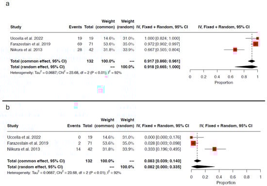 Forest plot of proportional meta-analysis for (a) concordance rate per hemipelvis and (b) discordance rate per hemipelvis [,,].