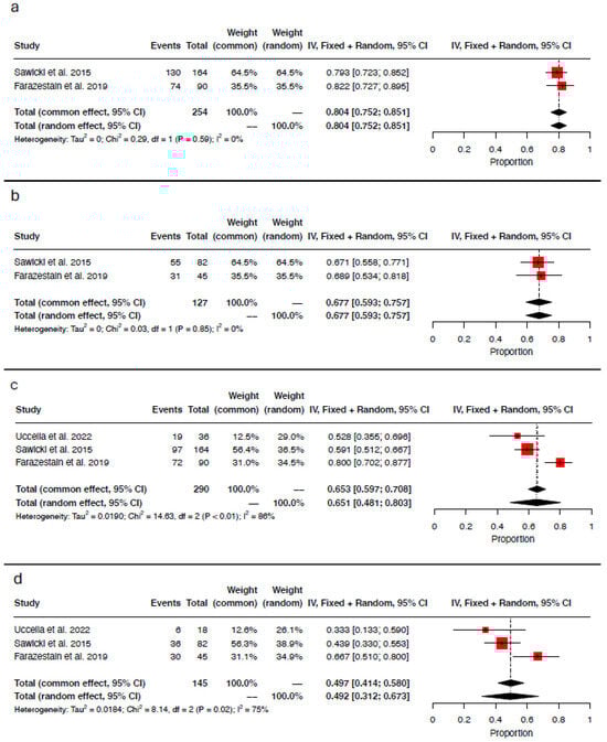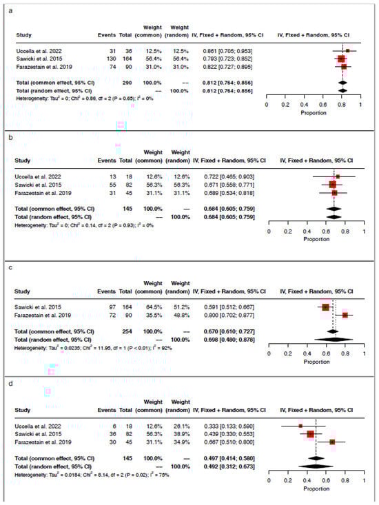 Only two authors reported results on technetium-99m alone (cervix) [,]. According to these findings, 204/254 hemipelves had at least one detected sentinel lymph node (pooled detection rate 80.4%; 95% CI 0.752–0.851; I2 = 0%; chi2 p-value = 0.59; Figure 3a). Bilateral mapping was achieved in 86/127 patients, with a pooled Technetium-99m bilateral detection rate of 67.7% (95% CI 0.593–0.757; I2 = 0%; chi2 p-value = 0.85; Figure 3b). Data regarding the injection of methylene blue alone (uterine corpus or utero-ovarian ligament) were available from three authors [,,]. At least one sentinel lymph node was detected in 188/290 hemipelves (pooled methylene blue detection rate 65.1%; 95% CI 0.481–0.803; I2 = 86%; chi2 p-value <0.01; Figure 3c). Bilateral mapping was accomplished in 72/145 individuals, resulting in a pooled methylene blue bilateral detection rate of 49.2% (95% CI 0.312–0.673; I2 = 75%; chi2 p value = 0.02; Figure 3d). Indocyanine green (cervix) was employed exclusively in the study by Uccella et al. [], with a detection rate of 86.1% per hemipelvis and a bilateral detection rate of 72.2%.