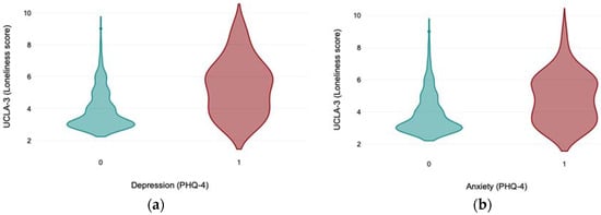 Figure 1a,b present the distribution of loneliness scores, measured by UCLA-3, with regard to the presence of depression (a) and anxiety (b), measured by PHQ-4, in older adults in Kazakhstan during the COVID-19 pandemic.
