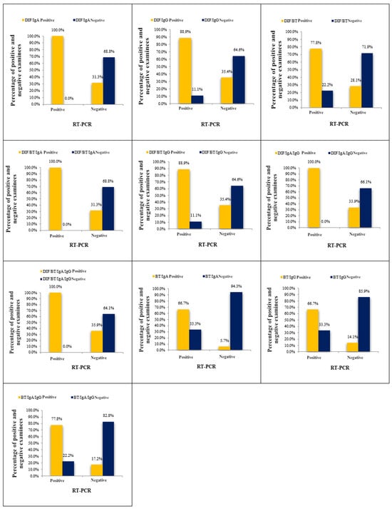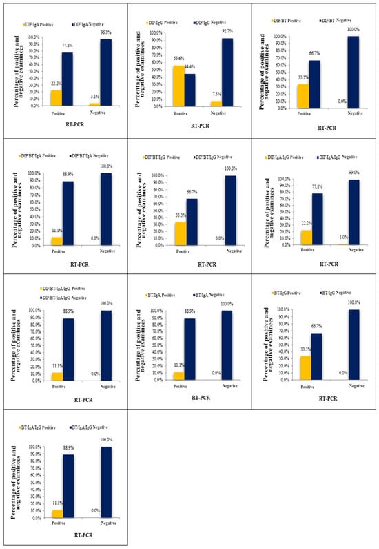 Table 2 and Figure 1 display the outcomes of C. trachomatis detection by a combination of “two or more tests positive” and RT-PCR assay. The agreement between the results of eleven combinations and the results obtained by the RT-PCR assay was evaluated. Among the eleven analyzed combinations, the values of the ORA (representing statistical agreement) ranged from 91.00–97.00%, while the values of the kappa index were 0.19–0.48. Notably, three combinations (DIF + RT; RT + IgG; DIF + RT + IgG) displayed superior performance and showed identical values of diagnostic parameter values. Due to significant variations among the tested combinations, we focused our analysis on those demonstrating the most favorable diagnostic parameters. Upon comparing the results obtained using three top-performing combinations and the RT-PCR method, we noted that, of the nine samples identified as positive on the basis of RT-PCR assay, the three first-rate combinations confirmed the diagnosis in three samples, while the remaining six samples were declared negative, resulting in a disagreement rate of 66.6% (false negative results). Conversely, there were no false positive results, as both diagnostic methods agreed on the negative results. Consequently, a total agreement of 97.00% was achieved, corresponding to a total disagreement of 3.00%. The results obtained from the three first-rate combinations and the RT-PCR method demonstrated a high percentage of total agreement, supported by a kappa index of 0.48 (Table 2).