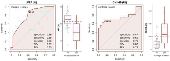 Youden’s J index was calculated for each coordinate of the ROC curve. The coordinate with the highest J index was used to determine the optimal cut-off values for LVEF and CK-MB. The cut-off for increased mortality risk was identified as an LVEF of 42.5%, although this threshold exhibited intermediate specificity at only 60%. The CK-MB threshold for increased risk was determined to be 494.5 U/L, with a specificity approaching 90% (Figure 1). Both LVEF and CK-MB demonstrated similar performance indices (DeLong test p-value = 0.917), with modest accuracies of 0.73 and 0.79, respectively, in predicting patient mortality (Figure 1). When analysing all patients included in the study, the same variables continued to serve as predictors of in-hospital death (Supplementary Table S2).