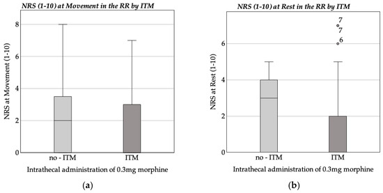 Boxplot of NRS at rest and movement in the recovery room (RR). (a) Average NRS at movement in the recovery room by ITM; (b) average NRS at rest in the recovery room by ITM.