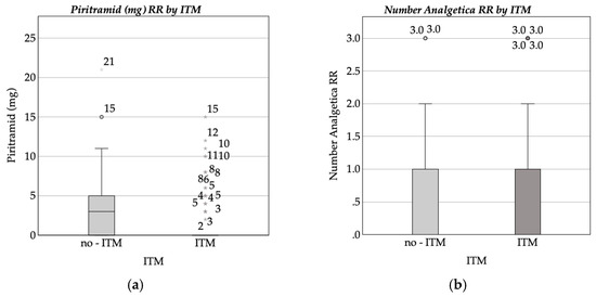 Boxplot of (a) intravenous piritramide dose (mg) administered in the recovery room (RR) by intrathecal morphine (ITM) administration status; (b) number of analgesics administered in the recovery room (RR) by intrathecal morphine (ITM) administration status.