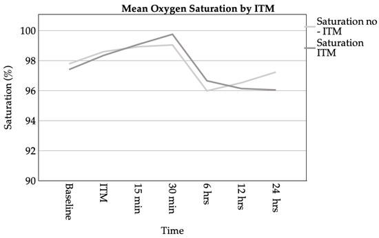 Line chart of mean oxygen saturation over time for patients with and without ITM administration. Measurements were taken at baseline, during ITM administration, and at intervals of 15 min, 30 min, 6 h, 12 h, and 24 h post-intervention.