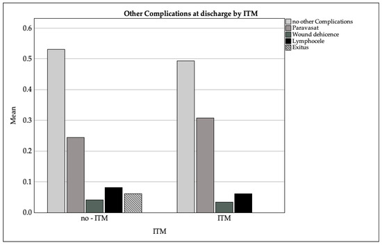 The Mann–Whitney U test revealed no statistically significant differences between the ITM and non-ITM groups with regard to the majority of complications, including vesicoureteral anastomotic insufficiency (p = 0.4 00), wound dehiscence (p = 0.651), and postoperative delirium (p = 0.651). The proportion of patients with no complications was also comparable (p = 0.651). Figure 4 displays a bar chart showing the distribution of side effects reported in discharge summaries, grouped by ITM administration.