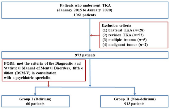 Flow diagram illustrating patient selection. TKA: Total knee arthroplasty; PODil: Postoperative delirium; DSM: Diagnostic and Statistical Manual of Mental Disorders.