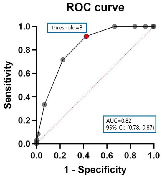 Receiver-operating characteristic (ROC) curves for Life’s Simple 7 score. The area under the curve, cut-off value, Youden’s index, sensitivity, and specificity of Life’s Simple 7 score were 0.82 (0.78–0.87), 8, 0.50, 0.92, and 0.58, respectively (p < 0.0001). Black solid line: ROC curve, red dotted line: reference line, black dot: Life’s Simple 7 score, red dot: cut-off value.