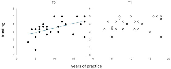 All participants in group E completed the study. In T1, the correlation between the practicing years and MAIA trusting was no longer significant (Figure 2).