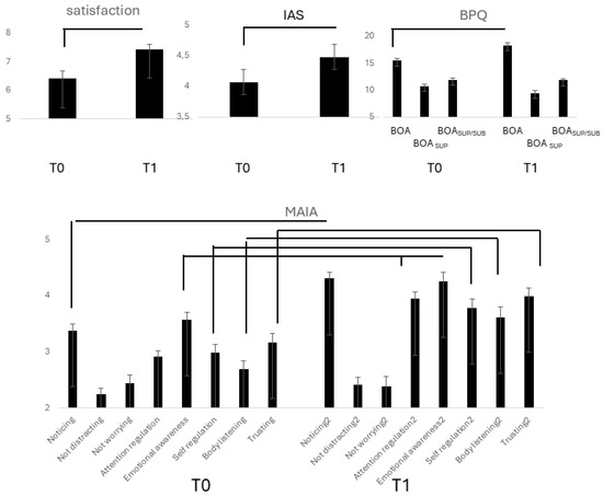 Lines indicate significant differences between T0 and T1 in subjective satisfaction with performance, BPQ, IAS, and MAIA scores in group E.