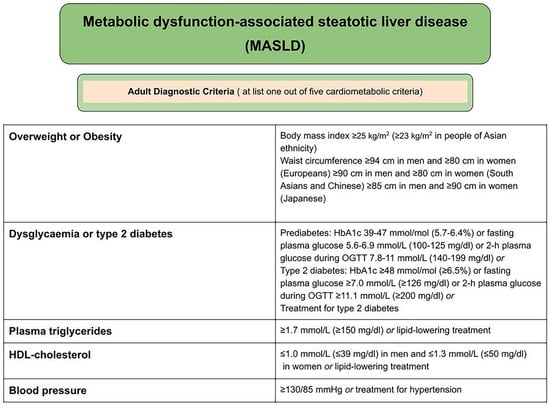 - Chan, W.K.; Chuah, K.H.; Rajaram, R.B.; Lim, L.L.; Ratnasingam, J.; Vethakkan, S.R. Metabolic Dysfunction-Associated Steatotic Liver Disease (MASLD): A State-of-the-Art Review. J. Obes. Metab. Syndr. 2023, 32, 197–213. [Google Scholar] [CrossRef]