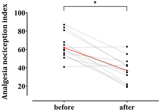 Individual changes in the Analgesia Nociception Index (ANI) after surgical noxious stimulation in patients who exhibited hemodynamic responses (n = 13). Among 28 enrolled patients, 13 demonstrated a hemodynamic response—defined as an increase in heart rate or mean blood pressure ≥ 20% from the baseline—within 5 min after a surgical noxious stimulus (uterine preparation, skin incision, or pneumoperitoneum creation). Red circles indicate mean values at the baseline (63.2 ± 13.6) and after stimulation (36.9 ± 13.8) (mean ± standard deviation). * p < 0.05.