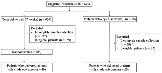 Flow chart of the patient selection. * Only participants who completed sample collection at five time points (term birth group) or three time points (preterm birth group) were included.