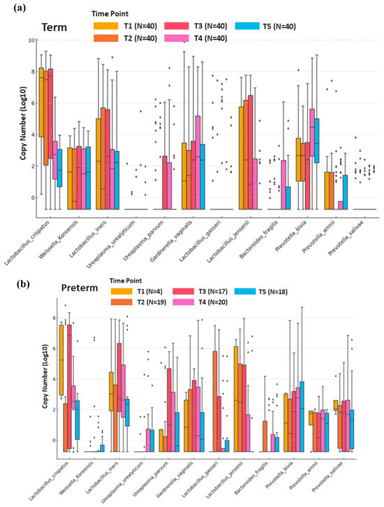 Figure 2a shows the abundance of various species within the VMB of term birth participants across five time points. The results indicate a microbiome profile dominated by Lactobacillus species. L. crispatus was consistently present at high levels, with copy numbers remaining at around 108 across all stages. Other Lactobacillus species, such as L. jensenii and L. iners, remained moderately abundant, with their highest levels seen in the mid-pregnancy stages (T2 and T3). W. koreensis also showed a stable presence during pregnancy and the postpartum period, suggesting that it may contribute to maintaining a balanced microbiome during pregnancy and after delivery. Following delivery, the VMB composition showed some shifts. Lactobacillus species exhibited a marked reduction in abundance during the postpartum period, while P. bivia and G. vaginalis showed an increase in abundance in the postpartum period.