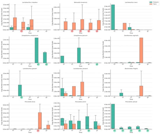 Comparison of vaginal microbiome composition between term and preterm birth groups at five time points (red or green circles above x-axis labels (T1: first trimester; T2: second trimester; T3: third trimester; P1: 1–2 weeks after delivery; P2: 1–2 months after delivery) show statistically significant differences (p < 0.05)).