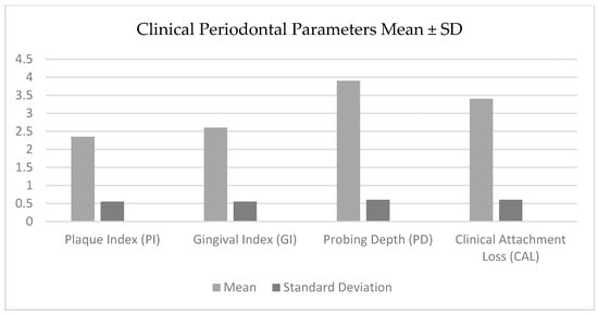 A Gingival Index (GI) of 2.6 ± 0.55 reflects moderate gingival inflammation across the cohort. Elevated GI values highlight the active inflammatory processes occurring in the earlier stages of periodontal disease, driven by the host’s immune response to bacterial plaque.