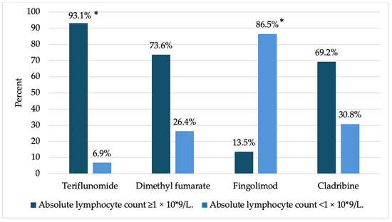 Lymphopenia was statistically significantly less frequent among TFN patients (93.1%; z = 6.8) and statistically significantly more frequent among FTY patients (86.5%; z = 8.9) (p < 0.001). No significant difference was observed between DMF and CLAD, with a higher proportion of patients who did not develop lymphopenia (73.6% and 69.20%, respectively) (Figure 2).