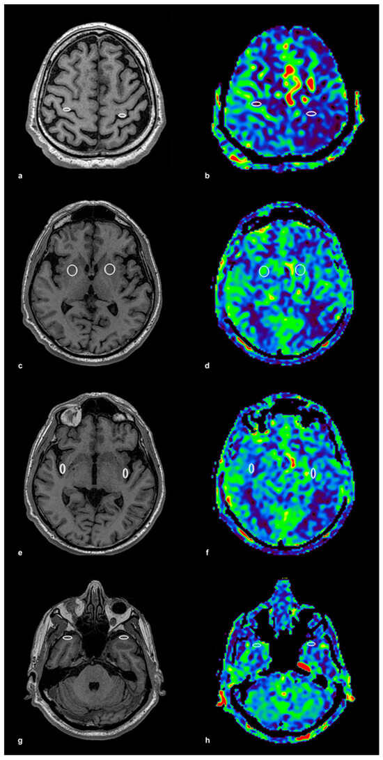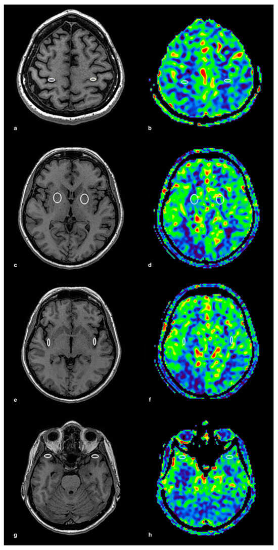 ROI Placement and ASL Perfusion Map in a Control Subject. This figure illustrates the placement of regions of interest (ROIs) on T1-weighted anatomical images and their corresponding arterial spin labeling (ASL) perfusion maps in a control subject. (a) T1-weighted image with ROI placement in the precentral gyrus (frontal cortex) bilaterally, ensuring precise localization in the gray matter, and (b) the corresponding ASL perfusion map with identically positioned ROIs for cerebral blood flow (CBF) quantification. (c) T1-weighted image with ROI placement in the lentiform nucleus bilaterally, and (d) the corresponding ASL perfusion map. (e) T1-weighted image with ROI placement in the insular cortex bilaterally, and (f) the corresponding ASL perfusion map. (g) T1-weighted image with ROI placement in the temporal cortex bilaterally, and (h) the corresponding ASL perfusion map. ROI sizes ranged from 15 to 40 mm2, with elliptical ROIs used in thinner cortical regions and circular ROIs in larger areas. The colored ASL perfusion maps (b,d,f,h) represent quantitatively measured cerebral blood flow (CBF), with warmer colors (red, yellow) corresponding to higher CBF values and cooler colors (green, blue) indicating lower values.