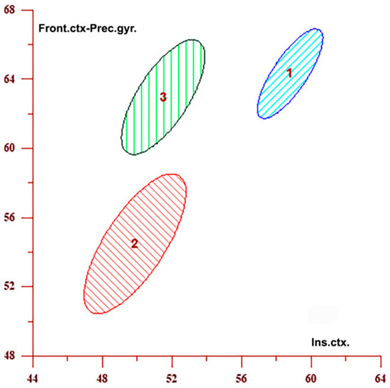The graph displays confidence interval ellipses representing CBF values in the regions that contribute the most to the differentiation between the ipsilateral (2) and contralateral (3) hemispheres in individuals with unilateral stenosis, as well as the control group (1), based on Table 6. These values were obtained in the insular cortex and the frontal cortex–precentral gyrus, which are the first two variables listed in Table 6. The graph shows that CBF values are highest in the control group (1), intermediate in the contralateral hemisphere (3), and lowest in the ipsilateral hemisphere (2) in individuals with unilateral stenosis, and that these groups are clearly separated.
