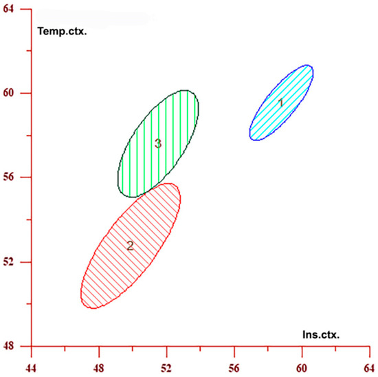 The graph displays confidence interval ellipses representing CBF values in the regions that contribute the most to the differentiation between the ipsilateral (2) and contralateral (3) hemispheres in individuals with unilateral stenosis, as well as the control group (1), based on Table 6. These values were obtained in the insular and temporal cortex, which are the first and third variables listed in Table 6. The graph shows that CBF values are highest in the control group (1), intermediate in the contralateral hemisphere (3), and lowest in the ipsilateral hemisphere (2) in individuals with unilateral stenosis. Furthermore, groups 2 and 3 (ipsilateral and contralateral hemispheres) are closer to each other, whereas the control group is clearly distinct from both.