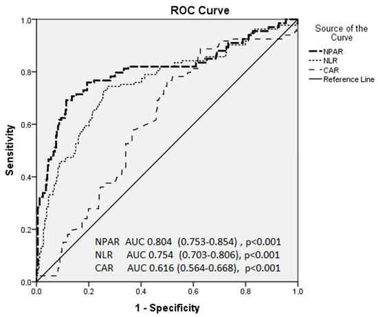 In the ROC analysis, the cut-off value for the NPAR indicating poor CCC was 1.78 with a sensitivity of 76.6% and specificity of 81.4% (area under ROC curve = 0.804 95% CI (0.753–0.854), p < 0.001). The cut-off value for CAR indicating poor CCC was 0.948 with a sensitivity of 76.1% and specificity of 51% (area under ROC curve = 0.616 95% CI (0.564–0.688), p < 0.001). The cut-off value for NLR to indicate poor CCC was 3.08 with a sensitivity of 74.4% and specificity of 73.1% (area under ROC curve = 0.754 95% CI (0.703–0.806), p < 0.001) (Figure 2).