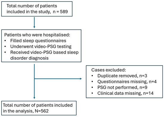Approval to conduct this study was obtained from the Kaunas Regional Biomedical Research Ethics Committee on 30 January 2025 (Approval No. BE-2-7). We retrospectively analysed the data from 562 adult patients who underwent routine video-polysomnography (PSG) at the Neurology Department, the Hospital of Lithuanian University of Health Sciences Kaunas Clinics, between 2018 and 2024. All the patients were referred for PSG due to subjective sleep disturbances identified during routine neurological consultations in the outpatient department. Our study’s inclusion criteria were adult patients (>18 years old), patients who gave answers to the specific sleep questionnaires (ESS, ISI, BQ, UNS, RBD-I, RBD1Q, and PADSS), and patients who underwent PSG testing. The sleep questionnaires used in this study were previously validated in the Lithuanian language. The exclusion criteria were children (<18 years of age), patients who did not fill in sleep questionnaires, patients who did not undergo PSG testing, and patients whose clinical data were missing. The inclusion process of patient cases is illustrated in the STROBE diagram (Figure 1). For each patient, we assessed paper-based records detailing sleep quality, comorbidities, regularly used medications, and responses to the validated sleep questionnaires. Additionally, we analysed the video-PSG results to establish PSG-confirmed diagnoses. To ensure diagnostic accuracy, final sleep diagnosis was verified by cross-referencing the PSG findings with the patients’ clinical records.