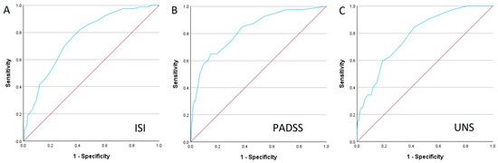 ROC curve analysis: (A) ISS for diagnosing insomnia; (B) PADSS for diagnosing parasomnia; (C) UNS for diagnosing hypersomnia.