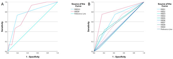 ROC curve analysis of RBD-I-9 and RBDQ1 for diagnosing REM sleep behaviour disorder. (A)—Comparison of both questionnaires. (B)—Comparison of each RBD-I-9 questions for diagnosing purposes of RBD.