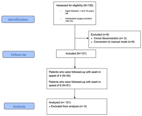 In total, 130 pediatric patients were enrolled in this study. Three patients were excluded due to a circuit disconnection, which altered the gas equilibrium in the system, and 6 patients were excluded due to a conversion to manual mode during AGC®. Consequently, a total of 121 patients were included. Among these, follow-up was conducted on 30 patients for whom a wash-in flow speed of 4 (WI4) was used and 91 patients for whom a high wash-in flow speed of 8 (WI8) was used; these speeds were chosen by physicians and applied in AGC® mode (Figure 1).