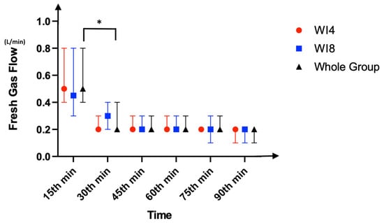 Timely fresh gas flow data for WI4, WI8, and whole group. Data are presented as median (IQR) values. *: p < 0.001.