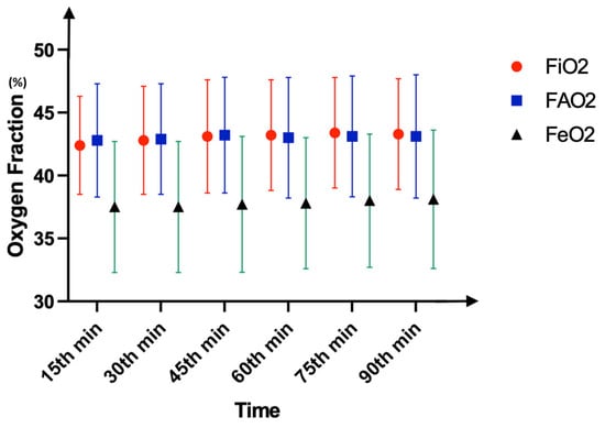 Inspired (FiO2), alveolar (FAO2), and expired (FeO2) fractions of oxygen in the whole group. Data are presented as median (IQR) values. Two-way repeated ANOVA did not exhibit any difference between parameters in both intergroup and intragroup analyses (p > 0.05).