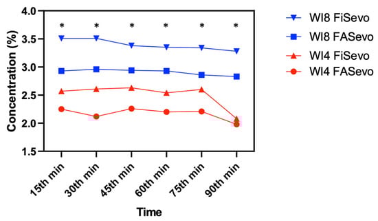 Alveolar (FASevo) and inspired (FiSevo) concentrations of sevoflurane during surgery. Data are presented as median values. Sevoflurane concentrations were significantly lower in the WI4 group at every time point. *: p < 0.001.