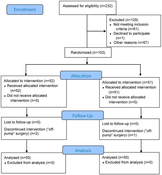 After excluding patients who did not meet the criteria for the study, 103 patients were included in the study and divided into two groups. Of these patients, three patients were excluded from the study because “off-pump” surgery was performed. Finally, 100 patients were analyzed, 50 in each group (Figure 1).