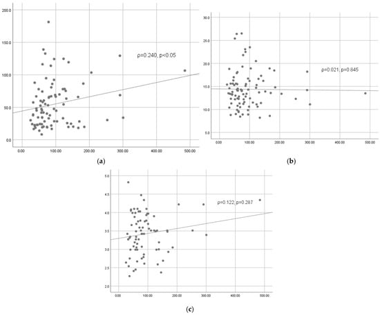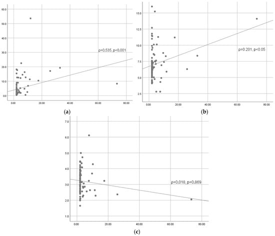The correlations between IL-6 and other inflammatory markers before surgery are shown in Table 7 and Figure 2. Spearman’s coefficient ρ = 0.535 indicates a moderate positive correlation between IL-6 and CRP (p < 0.001). There is a weak positive correlation between the preoperative values of IL-6 and WBC (ρ = 0.201, p < 0.05), while there is no significant correlation between IL-6 and fibrinogen (ρ = 0.018, p = 0.869).