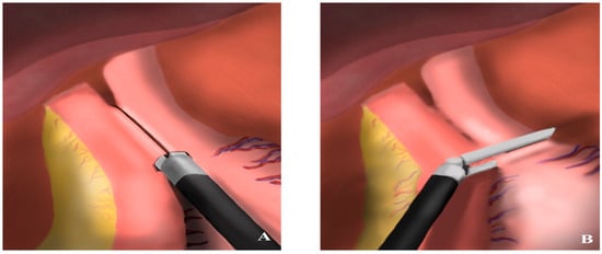 Gastric cancer is a common malignant tumor that ranks fifth worldwide in both incidence and mortality []. Over the past 30 years, the successful eradication of helicobacter pylori infection, which has been primarily been held responsible for distal gastric cancer etiology, along with a concurrent increase in autoimmune gastritis and dysbiosis of the gastric microbiome factors implicated in proximal gastric cancer have led to a significant rise in the incidence of proximal gastric cancer [,,,,]. Despite the increasing trend toward a multidisciplinary approach, surgery remains the primary treatment for proximal gastric adenocarcinoma. Total gastrectomy is a preferred surgical technique for treating conditions such as proximally located gastric cancer and large gastric ulcers. In recent years, the increasing popularity of minimally invasive surgery, advancements in laparoscopic instruments and techniques, and growing surgical experience have enabled total laparoscopic total gastrectomy (TLTG) to be performed with increasing frequency. Compared to open surgery, the laparoscopic approach is less invasive, offering advantages such as shorter hospital stays, reduced bleeding, faster recovery times, and favorable cosmetic outcomes []. However, due to technical challenges associated with the esophagojejunostomy (EJ) anastomosis procedure and concerns regarding inherent oncological safety, TLTG has not yet been as widely accepted as laparoscopic-assisted total gastrectomy (LATG). One of the most technically demanding aspects of this surgical procedure is the esophagojejunostomy (EJ), which establishes the connection between the esophagus and jejunum. If not performed properly, EJ poses a risk for postoperative complications such as anastomotic leakage, stenosis, rotation, and stricture. The incidence of anastomotic complications such as postoperative leakage and stenosis is relatively higher in laparoscopic procedures compared to open techniques [].